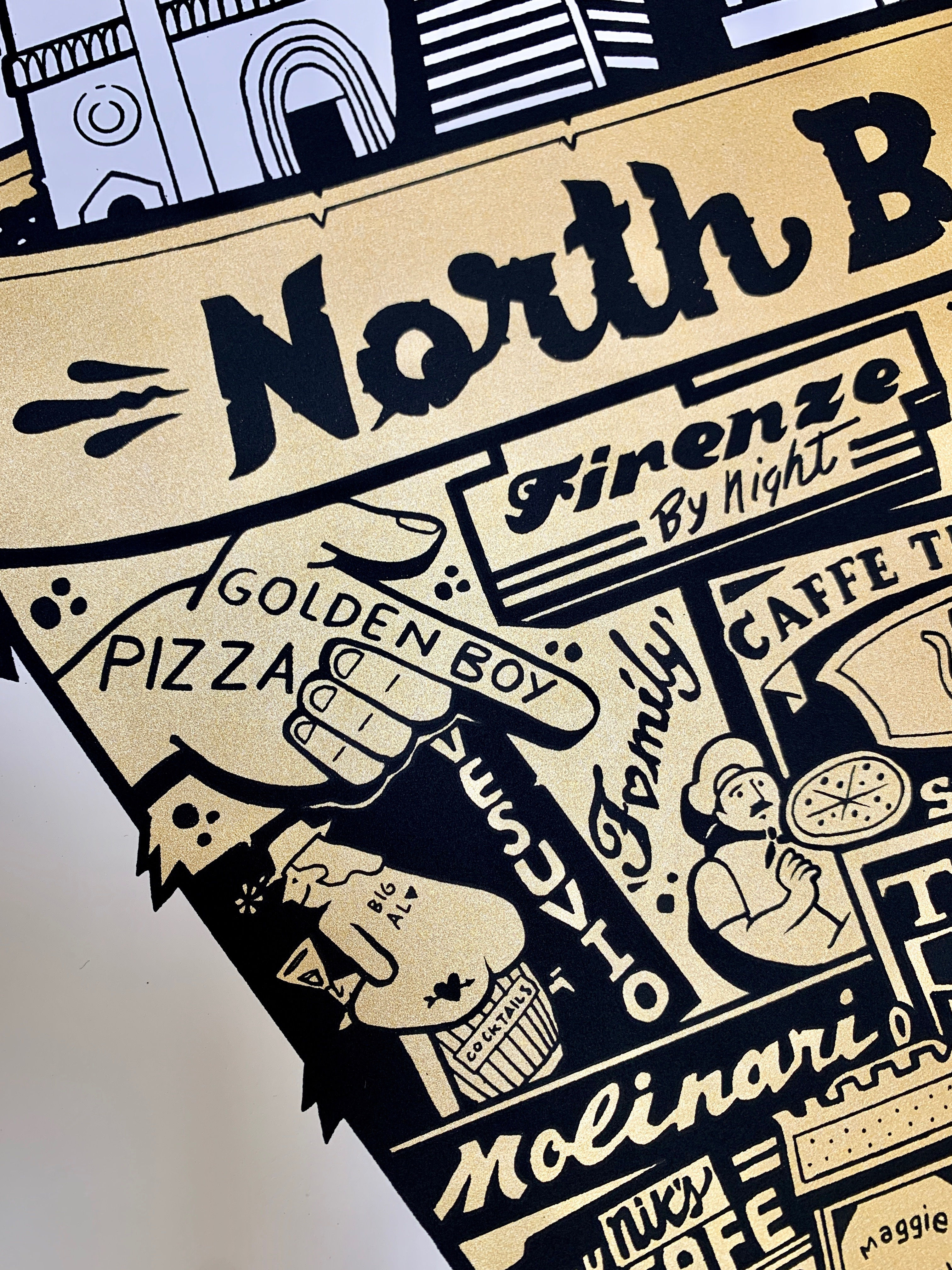 "This screen print was created, in a series of illustrated North Beach prints, as a fundraiser for my out of work bartender and server friends here in North Beach, San Francisco, California. 100 prints sold for $100 each will raise 10k, which I plan to donate 100%. Sadly, this will only barely scratch the surface of the financial disaster faced by my neighborhood service industry homies. Last week I drew this image with those friends, with their struggle in mind. Please help me if you can to raise some much needed funds to support the backbone of these amazing bars and restaurants here in the greatest city on earth."