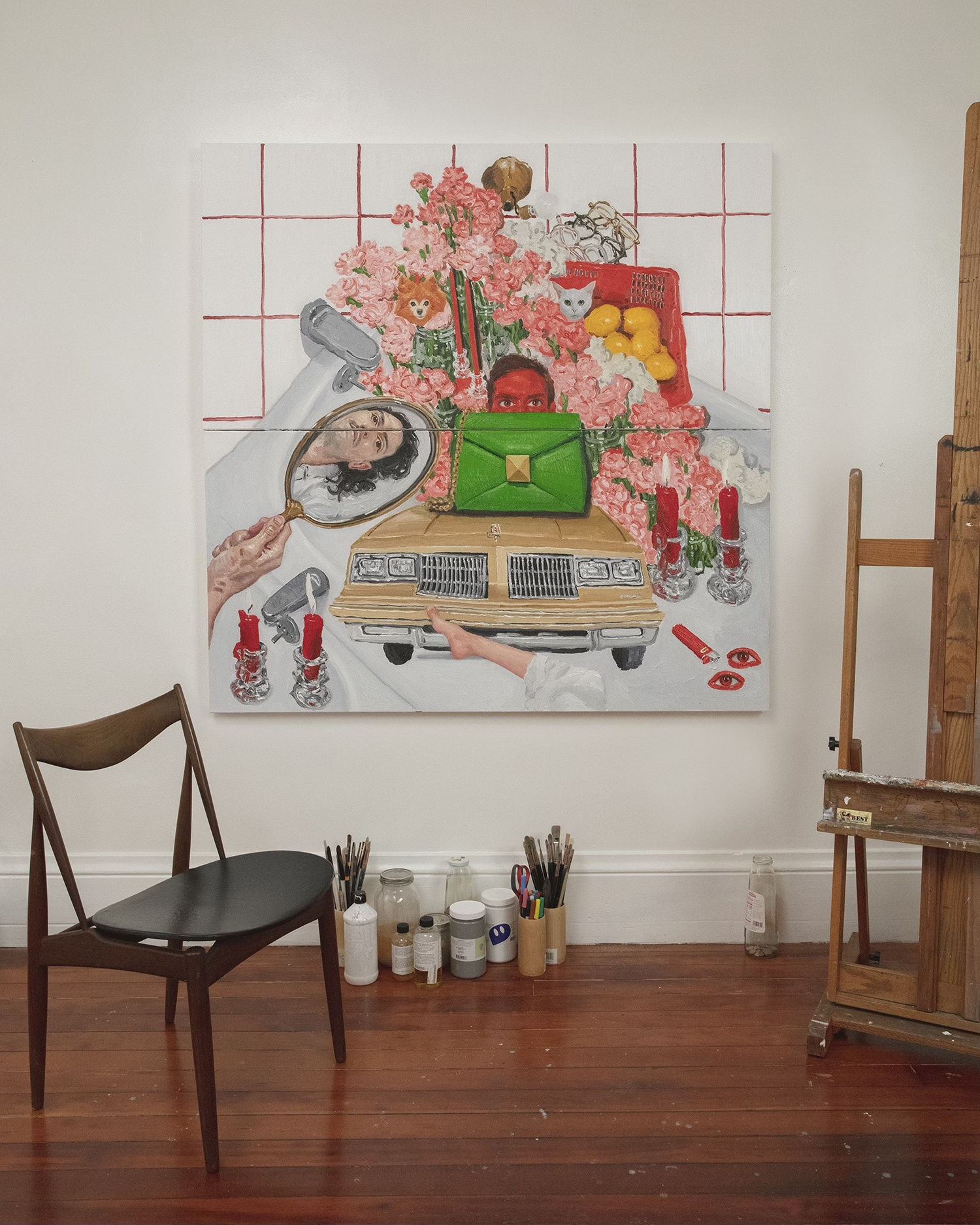 Villabla is one of three artists chosen by Valentino to paint their One Stud bag from the Rendez-Vous collection. The San Francisco-based artist configured the bag into his signature collage-style art featuring everyday objects and self-portraits.