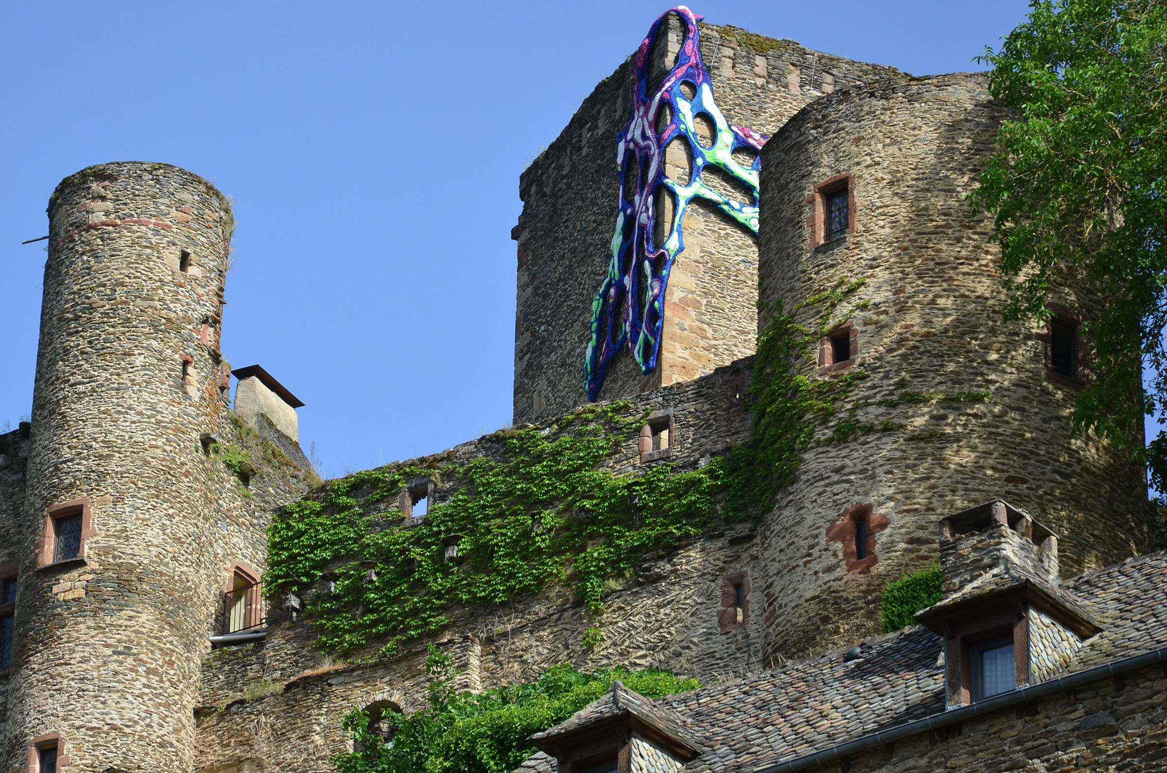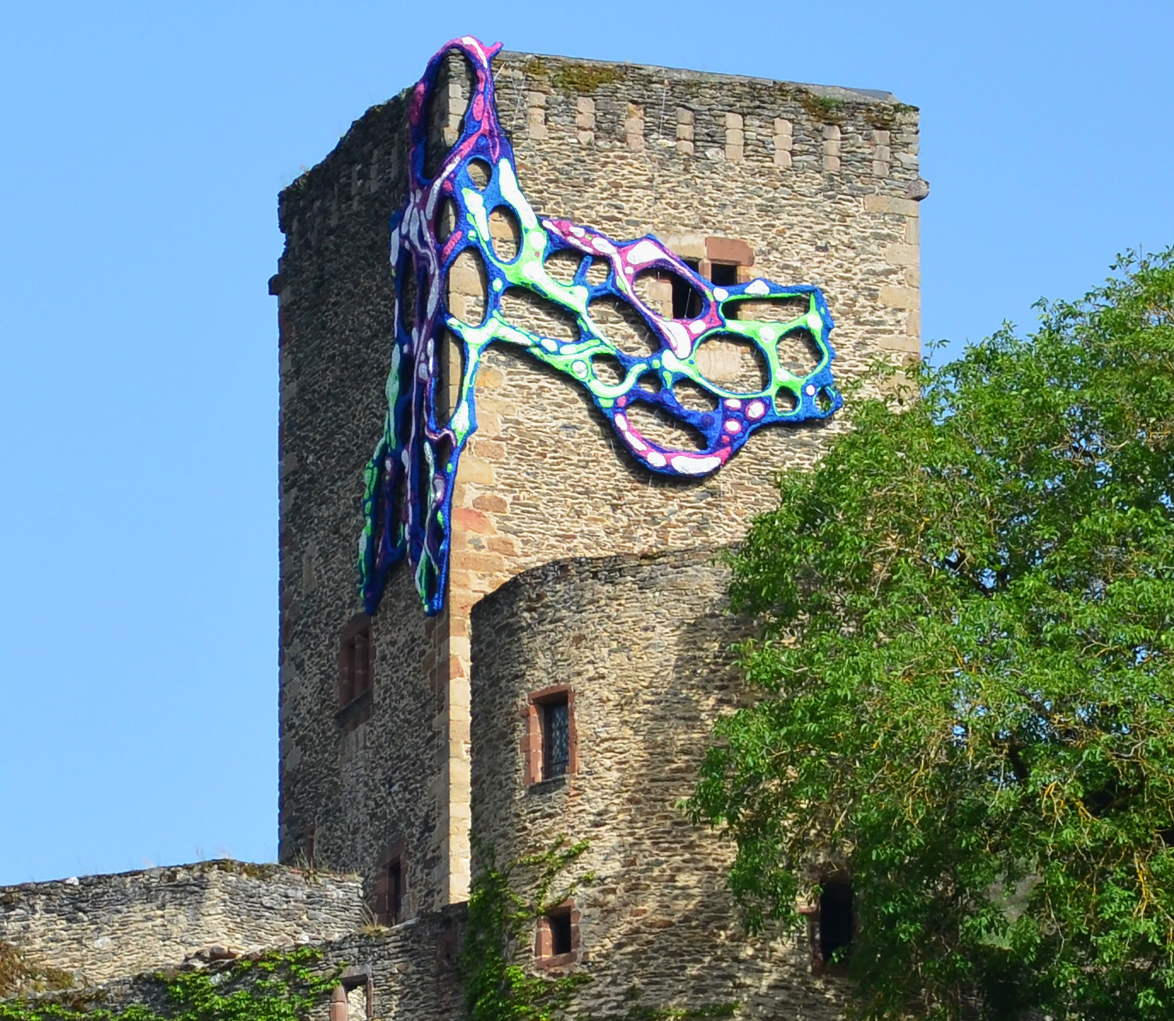 Ignis Fatuus, an enormous site specific installation by Crystal Wagner was installed in June of 2019. It wraps around the facade of Chateau Belcastel, contrasting itself against the centuries old stone architecture. The 9th century French castle is also host to a solo exhibition by Wagner that will be on display until September.