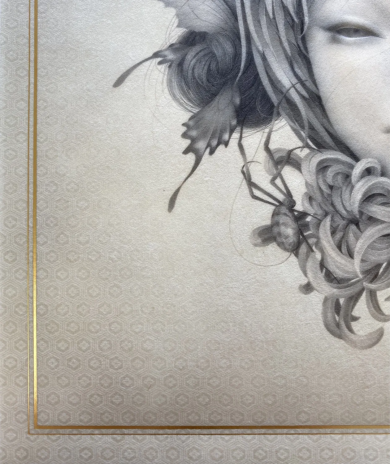 "Asai Yume" is based on Ozabu's graphite drawing of the same name, and comes as a signed and numbered ediition of 90 copies. These digitally based amalgam prints were carefully made on fine Kozo paper and feature gold details and relief techniques. The prints measure 11 x 11 inches, and are hinge-mounted to a 15-1/16 x 13-7/16 inch sheet of deckled archival printmaking paper to display the full luster of the final print.